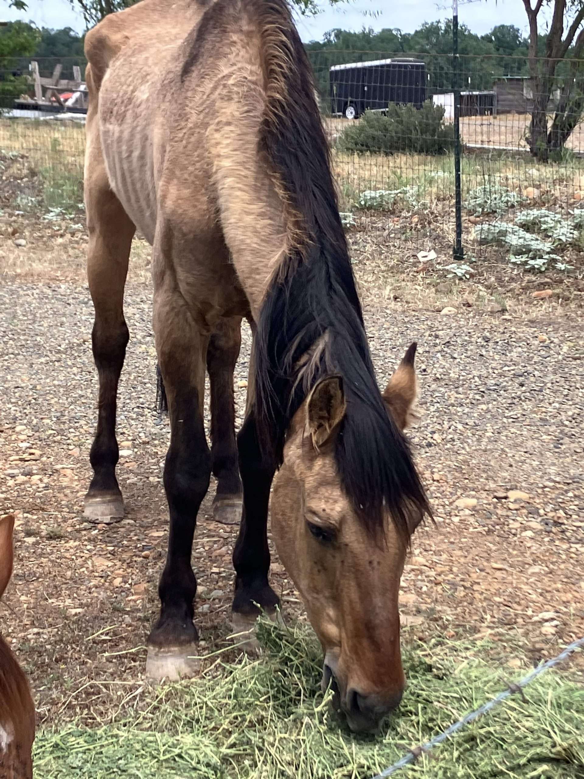 This is Ol Buck. Abandoned at a kind person’s property after someone asked about pasture to feed some horses. He and his paso mare friend (now ‘Serafina’) were said to have been owned by a gentleman in a nearby town, who had a heart attack over the winter and nobody was able to get in with the snow to feed the horses.